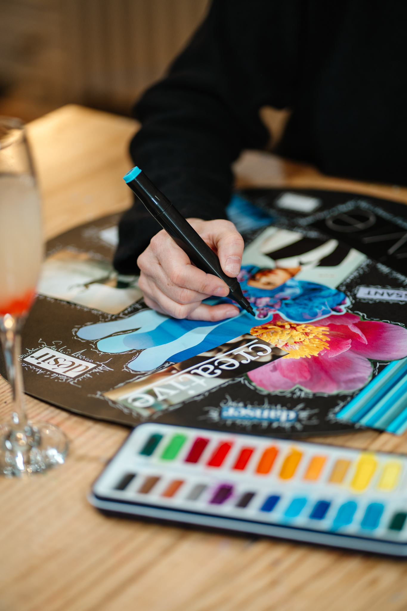 Réalise une pièce artistique sur un papier aquarelle, un carnet avec tout le matériel fourni : aquarelle, acrylique, pastels, étampes, pochoirs, crayons, images, revues et plus encore.